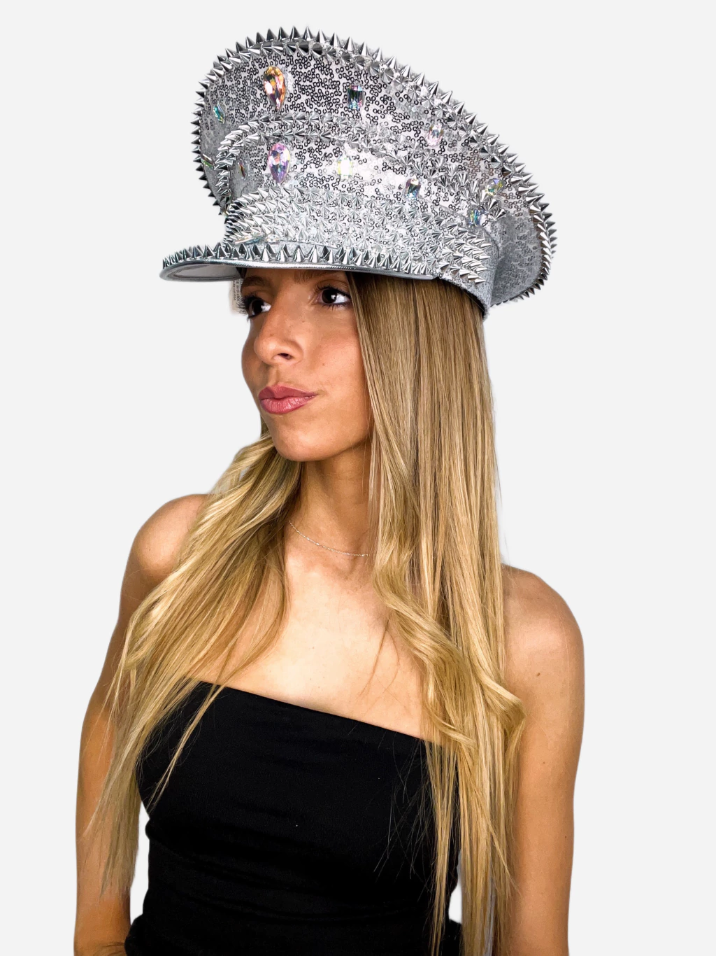 Este sombrero estilo almirante es una joya dorada: rígido, estructurado y lleno de mini tachas brillantes que le dan un look poderoso y fashionista. Ideal para la homenajeada, la cumpleañera o quien quiera robarse todas las miradas en la pista.