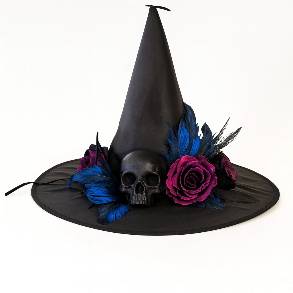 “Sombrero de bruja en color negro con calavera decorativa, plumas azules y rosas violetas. Una pieza única para quienes quieren sobresalir con un estilo impactante, premium y lleno de detalles de alta calidad.”