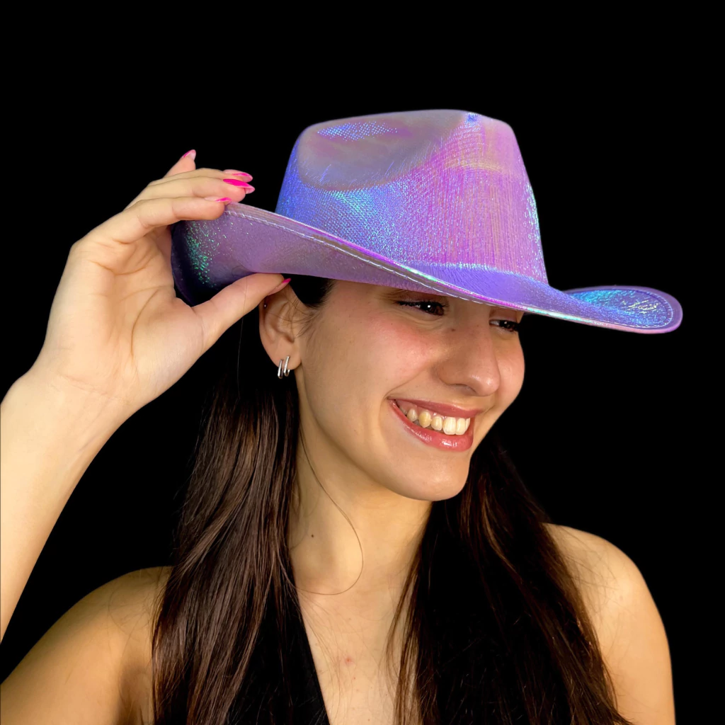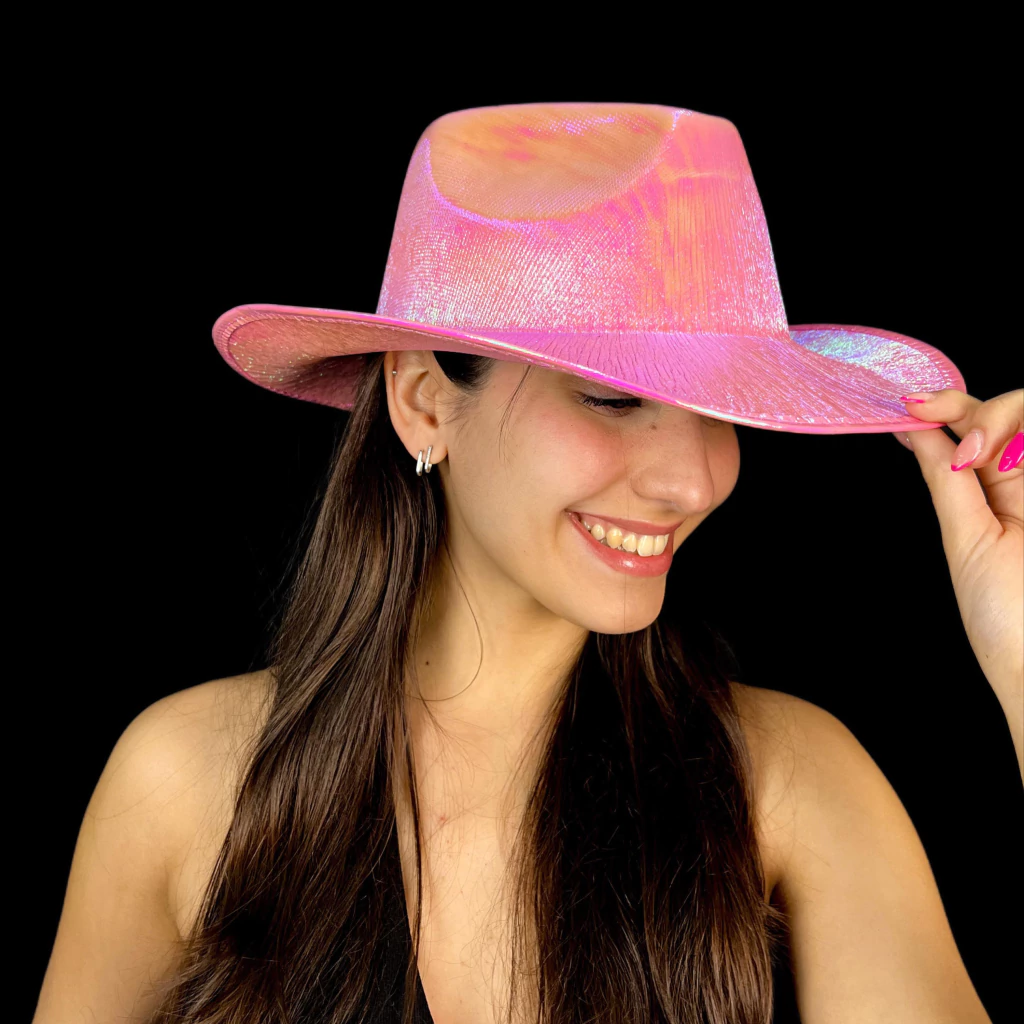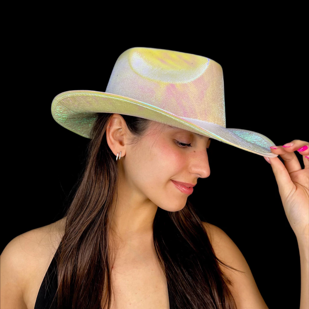 ¡El brillo que tu look estaba esperando! Este sombrero estilo cowboy con efecto tornasolado es el accesorio estrella para eventos, fiestas, recitales o sesiones de fotos. Su acabado brillante refleja distintos tonos según la luz, logrando un efecto glam y moderno.